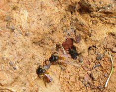 In einer Lehmfläche konnten sofort die Mauerbienen beim Bau ihrer Bruthöhlen beobachtet werden. Die ersten Helfer, die den Boden modellierten, waren ganz überrascht: „Hier lebt was!“
